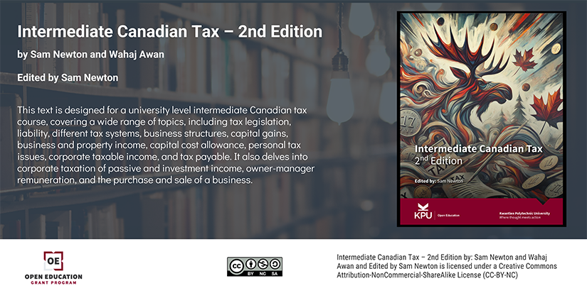 Hi everyone! Apologies for sending these separately, but the listserv has size limits and I couldn’t fit them all into one… I’m excited to share with you the following new editions of 2 OERs that have been published at KPU over the summer: [cid:image001.png@01DC18E2.58B9CF40] Introductory Canadian Tax – 2nd Edition By Sam Newton This text is designed for a university level introductory Canadian tax course, providing an overview of Canadian tax law and covering topics such as tax legislation, liability, key tax concepts, calculations, residency, filing, employment, student tax issues, business income, capital gains, GST, and other deductions. It is designed to be a comprehensive resource for both students and teachers, offering clear and concise explanations to make complex tax concepts accessible. This book aims to support learning and teaching needs by providing a solid foundation in Canadian tax law. Visit the Resource<https://kpu.pressbooks.pub/introcanadiantax2e/> [cid:image002.png@01DC18E2.58B9CF40] Intermediate Canadian Tax – 2nd Edition By Sam Newton This text is designed for a university level intermediate Canadian tax course, covering a wide range of topics, including tax legislation, liability, different tax systems, business structures, capital gains, business and property income, capital cost allowance, personal tax issues, corporate taxable income, and tax payable. It also delves into corporate taxation of passive and investment income, owner-manager remuneration, and the purchase and sale of a business. Visit the Resource<https://kpu.pressbooks.pub/intercanadiantax2e/> [cid:image003.png@01DC18E2.58B9CF40] Learn about KPU’s Open Publishing Suite (OPUS)<https://www.kpu.ca/library/OPUS> * Browse our complete catalogue<https://kpu.pressbooks.pub/catalog/openkpu> * Learn more about KPU Open Education<http://www.kpu.ca/open> Through active intentional partnering, the Teaching & Learning Commons provides pedagogical leadership that is grounded in community, ethics, creativity, and care. Kwantlen Polytechnic University ► Where thought meets action I respectfully acknowledge that I work in a region that overlaps with the unceded, traditional and ancestral lands of the xʷməθkʷəy̓əm (Musqueam<https://www.musqueam.bc.ca/>), q̓ic̓əy̓ (Katzie<https://katzie.ca/>), scəw̓aθən məsteyəxʷ (Tsawwassen<https://tsawwassenfirstnation.com/>), kʷikʷəƛ̓əm (Kwikwetlem<https://www.kwikwetlem.com/>), SEMYOME (Semiahmoo<https://www.semiahmoofirstnation.ca/>),qiqéyt (Qayqayt), and the qʼʷa:n̓ƛʼən̓ (Kwantlen<https://www.kwantlenfn.ca/>), which gifted its name to this university. In the cause of reconciliation, I recognize and commit to address and reduce ongoing systemic colonialism, oppression and racism that Indigenous Peoples continue to experience.