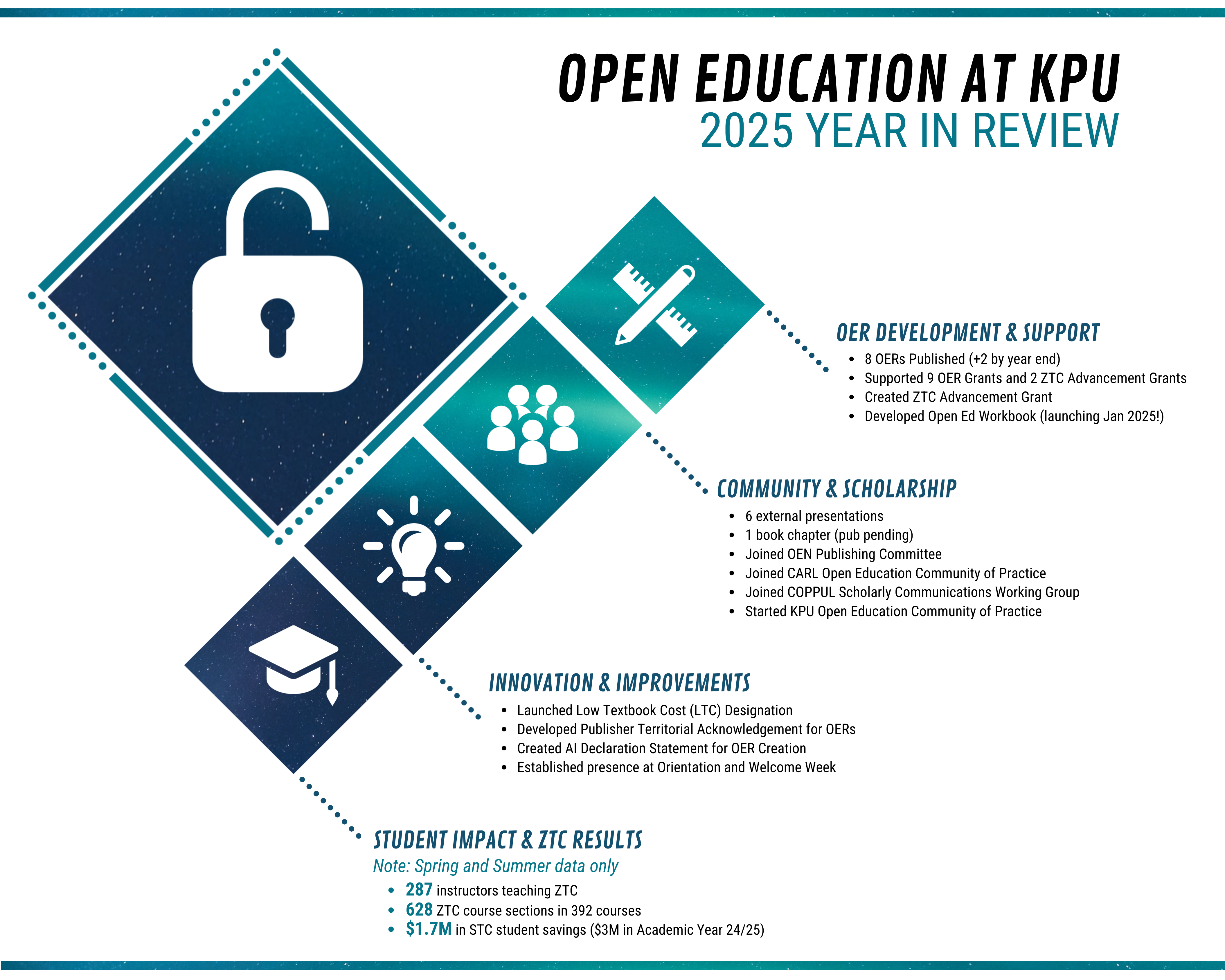 Thanks for sharing this Amanda. I had not looked at the ZTC dashboard for some time; it is so great to see the infiltration of these courses and the savings they bring to student. When tied with fill rates and success rates of students enrolled in ZTC courses, such a big win for students and KPU. Todd [logo gif] Todd Mundle (he/him/his) how to pronounce my name<https://namedrop.io/toddmundle> University Librarian Todd.Mundle@kpu.ca<mailto:Todd.Mundle@kpu.ca> 604.599.3400 kpu.ca/library<http://www.kpu.ca/library> Kwantlen Polytechnic University ► Where thought meets action We at Kwantlen Polytechnic University respectfully acknowledge that we live, work and study in a region that overlaps with the unceded traditional and ancestral First Nations territories of the Musqueam<https://www.musqueam.bc.ca/> xwməθkwəyə̓ m, Katzie<https://www.bcafn.ca/first-nations-bc/lower-mainland-southwest/katzie-first-nation> qi̓ cə̓ y̓, Semiahmoo<https://www.bcafn.ca/first-nations-bc/lower-mainland-southwest/semiahmoo> SEMYOME, Tsawwassen<https://tsawwassenfirstnation.com/> scə̓ waθən, Qayqayt<https://www.facebook.com/qayqayt/> qiqéyt, and Kwikwetlem<https://www.kwikwetlem.com/> kwikwəƛə̓ m; and with the lands of the Kwantlen<https://www.kwantlenfn.ca/> First Nation qw̓ ɑ:nƛ̓ ə̓ n̓, which gifted its name to this university. This email may contain confidential and/or privileged information. If you received this email in error please delete the email and inform the sender immediately. Unauthorized distribution or use is strictly prohibited. From: openkpu@lists.bccampus.ca <openkpu@lists.bccampus.ca> Sent: Wednesday, December 10, 2025 9:19 AM To: openkpu@lists.bccampus.ca Subject: [Openkpu] Celebrating 2025 Open Education at KPU CAUTION External Sender: Do not click links or open attachments unless you recognize the sender and know the content is safe. Dear KPU Community, As we approach the end of 2024, I would like to take a moment to pause and reflect on what we've accomplished together in Open Education this year. It's been a challenging year for everyone, and we know that next year will bring its own set of demands. That makes this moment of recognition all the more important. What We've Achieved Together This year, the Open Education initiative at KPU continued to grow and evolve, thanks to the dedication of faculty, staff, and students who believe in accessible, adaptable, and equitable education. Here's what KPU Open has accomplished: OER Development & Support * Published 8 Open Educational Resources (with 2 more coming by year's end) * Supported 9 OER Grants and 2 ZTC Advancement Grants * Created our new ZTC Advancement Grant to leverage insights from our ZTC Credential Map analysis * Developed the Open Ed Workbook (launching in January 2025!) Community & Scholarship * Delivered 6 external presentations as guest speakers and panel participants * Wrote 1 book chapter (publication pending) * Joined the CARL Open Education Community of Practice<https://www.carl-abrc.ca/advancing-teaching-learning/open-education/open-education-community-of-practice/> (Karen, Library) * Started our own Open Education Community of Practice<https://www.kpu.ca/teaching-and-learning/learning-opportunities/cop/open-education> at KPU * Completed our term on the Open Education Network (OEN)<https://open.umn.edu/oen/community-leaders> Steering Committee and joined the OEN Publishing Advisory Committee (Amanda, T&L Commons) * Joined the COPPUL Scholarly Communications Working Group<https://coppul.ca/scwg/homepage/> (Karen, Library) Innovation & Improvements * Launched the Low Textbook Cost (LTC) Designation * Wrote a Territorial Acknowledgement for KPU as an OER publisher, and developed a Territorial Acknowledgement Pressbooks Template<https://kpu.pressbooks.pub/booktemplate/front-matter/territorial-acknowledgement/> * Created an AI Declaration Framework for OER Creation [DOCX]<https://kpu.pressbooks.pub/app/uploads/sites/263/2025/11/AI-Declaration-Framework-for-OER-Creation.docx>; an AI Use Self-Assessment Rubric [DOCX]<https://kpu.pressbooks.pub/app/uploads/sites/263/2025/11/AI-Use-Rubric-for-OER-Creation.docx>, and an AI Declaration Statement Pressbooks Template<https://kpu.pressbooks.pub/booktemplate/front-matter/ai-declaration-statement/> * Established presence at New Student Orientation and Welcome Week, connecting directly with students about ZTC/LTC Student Impact & ZTC Results We’re waiting for Fall ZTC data to come in, but here is what we’ve done in Spring and Summer this year: * 287 Instructors teaching ZTC; 73 for the first time! * 628 ZTC course sections in 392 courses (an average of 27.5% of sections were ZTC) * $1.7M in ZTC student savings ($3M in Academic Year 2024/2025) I look forward to seeing the stats from Fall 2025! See more stats on our Zero Textbook Cost Data Dashboard<https://www.kpu.ca/open/ztc#dashboard> [cid:image003.png@01DC69C3.8C7C7C60] Looking Forward The work we've done this year strengthens the foundation for what comes next. While we know the road ahead will have its challenges, we face them with the knowledge that what we're building (accessible, effective, equitable education) matters deeply. Thank you to every faculty member who adopted OER, every staff member who supported these initiatives, and every student who advocated for affordable education. This work is a collective effort, and it's one we're proud to be part of alongside you. Wishing you all a restful break, Amanda [logo gif] Amanda Grey (she/her) Open Education Strategist, Teaching & Learning Commons t 604-599-3345 e amanda.grey@kpu.ca<mailto:amanda.grey@kpu.ca> w www.kpu.ca/open Through active intentional partnering, the Teaching & Learning Commons provides pedagogical leadership that is grounded in community, ethics, creativity, and care. Kwantlen Polytechnic University ► Where thought meets action I respectfully acknowledge that I work in a region that overlaps with the unceded, traditional and ancestr